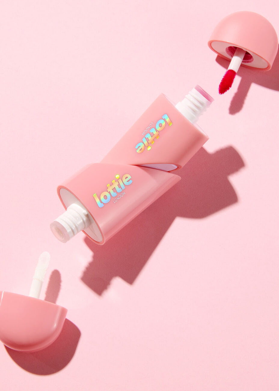 The Lottie London Twisted Heart Duo Heart Lip Tint & Gloss is the ultimate lip-loving duo of gloss and colour to leave lips looking glossy with a tint of colour. The innovative twist applicator with one side a deep rose lip tint which can be used on cheeks too, the other side a clear gloss infused with Hyaluronic Acid and Argan Oil to boost hydration leaving lips looking fuller and plumper. This lip duo can also double as a fidget toy - benefiting not only your lips, but your mind too.