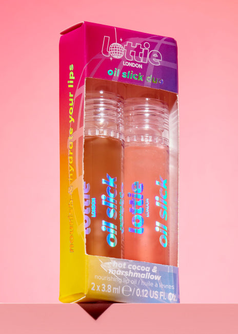 Achieve instantly juicy lips with absolutely no tackiness with the vegan Lottie London’s Oil Slick Duo. These super-glossy, nourishing lip oils are packed full of Vitamin E and B, rich jojoba oil, sweet almond oil and Omega-3 to treat the lips to the ultimate hydration, while leaving a flawless glossy finish and irresistibly sweet without the stickiness. Dive into the good enough to eat rich, chocolatey allure of the brown-tinted Hot Cocoa and let the pink-tinted Marshmallow transport you to a world of sweet, toasted marshmallow dreams!